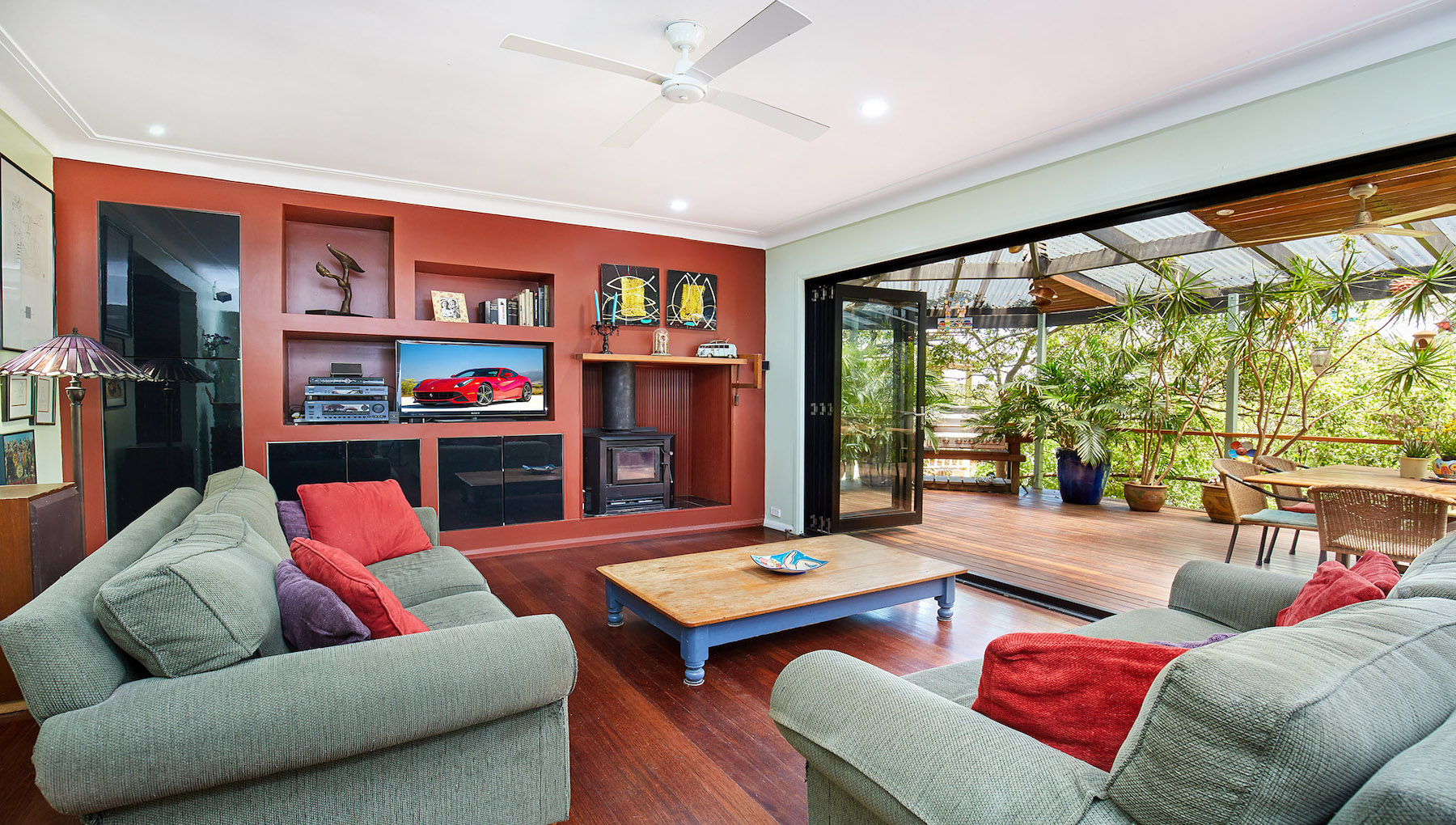 Integrated storage features in the lounge room, along with a timber fireplace and built-in speakers. The deep kitchen has stainless steel appliances and casual bench seating. Soaked in natural light, a corner spa bath sits under a skylight in the family bathroom, with louvre windows emphasising the tropical ambience.