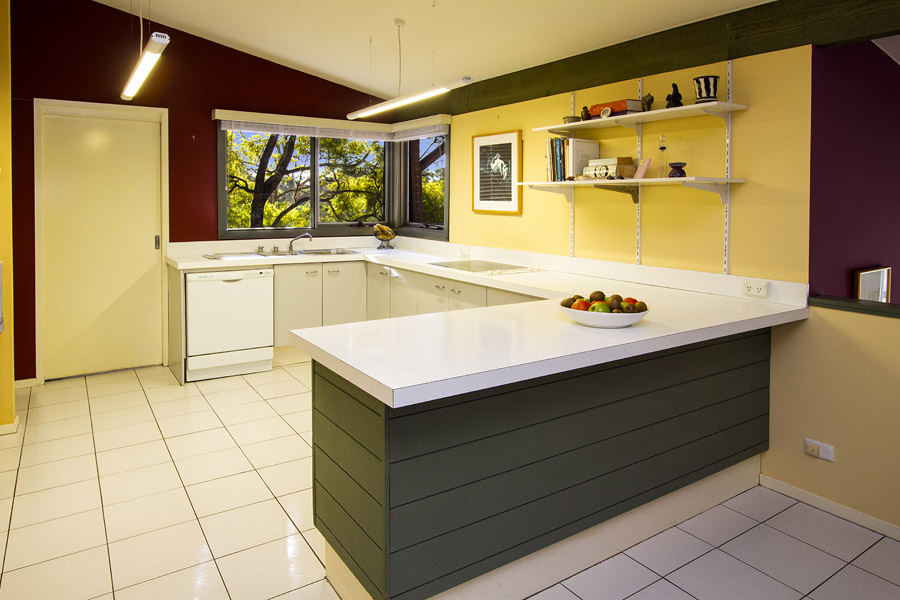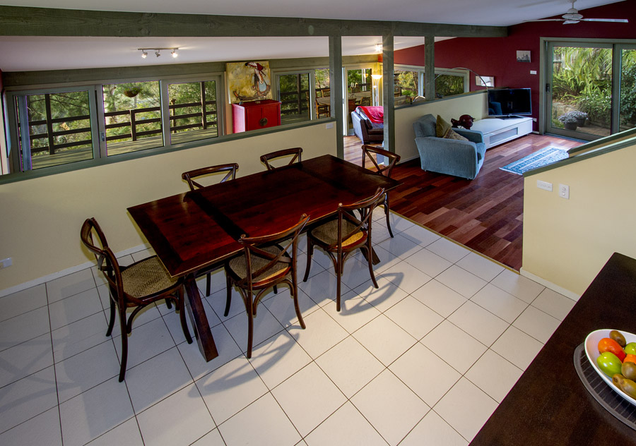 The kitchen looks out to the treetops and flows onto a dining area. Two living spaces—one looking onto a pleasant courtyard and another to a large entertaining deck and bush garden—are there for your family and friends to gather and share time together.