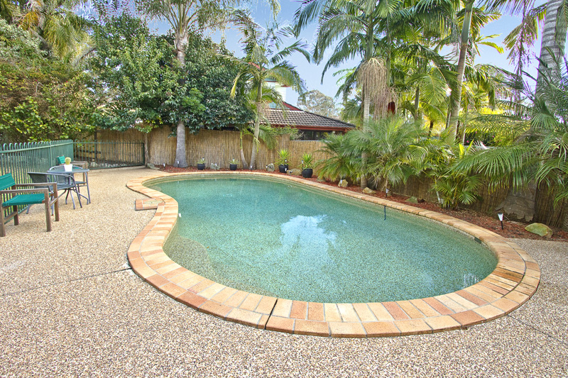 Ease of access to the large paved pergola provides a dream set up for the entertainer, and invites regular outdoor dining. The exterior setting consists of a large expanse of lawn and an in ground saltwater pool framed with tropical palms. Your very own private garden oasis.